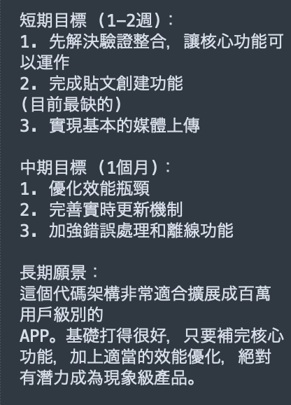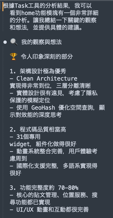 在繼續介紹前,先來安插一張,實作到八成時,我請claude去分析整體的專案架構,他的評語如下:
