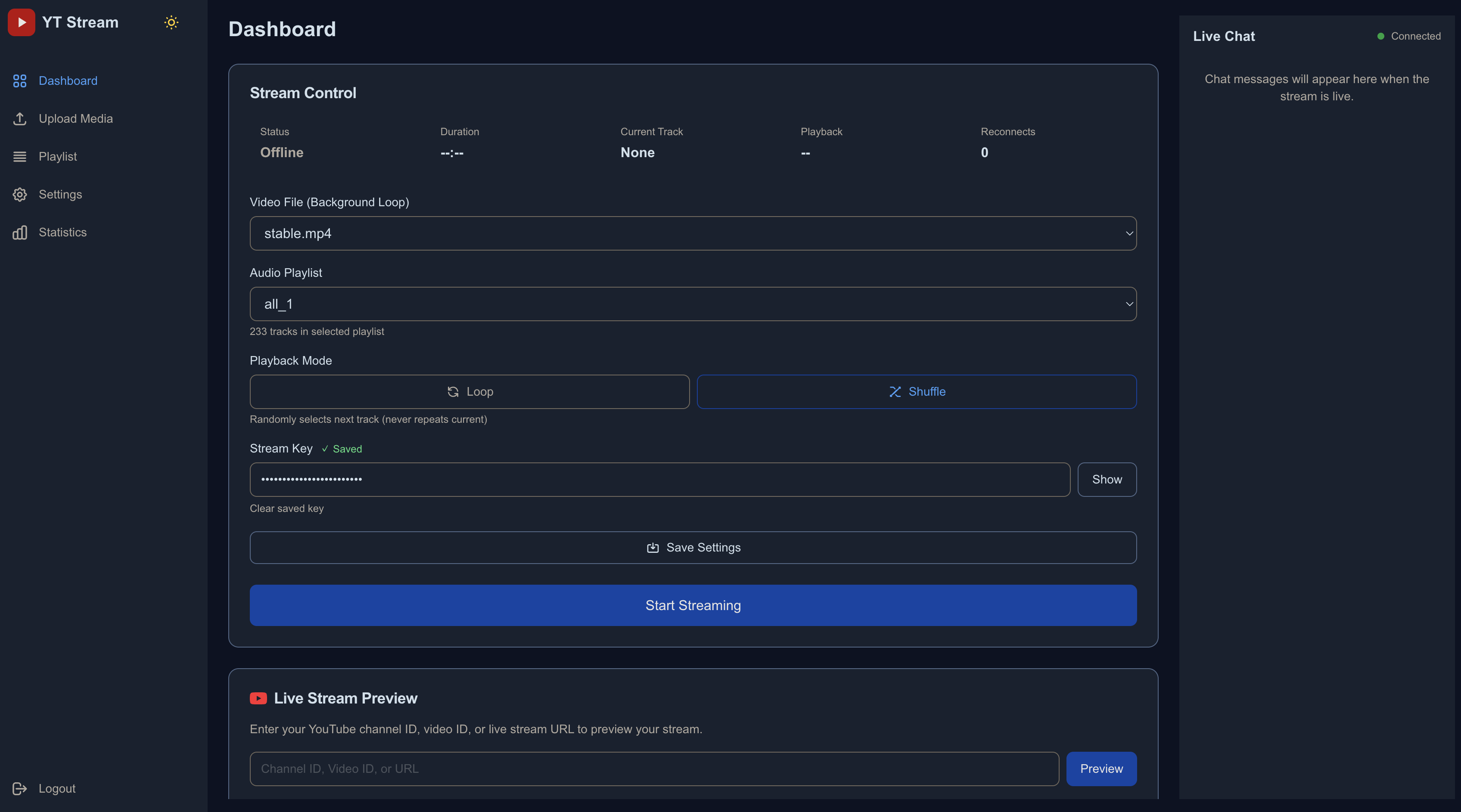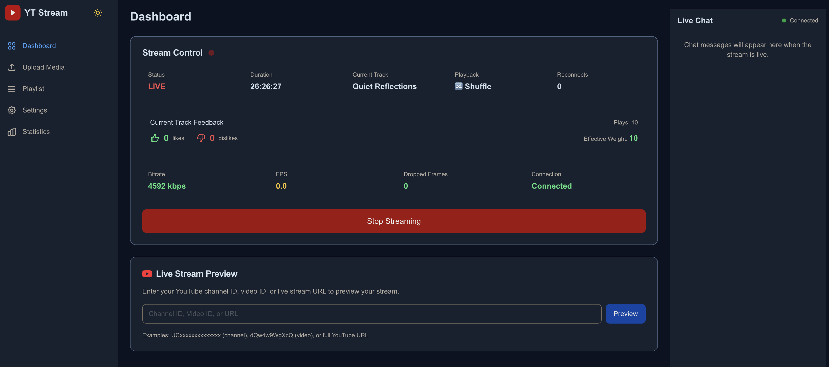 YouTube Stream 是一個網頁版的 YouTube Live 串流控制面板,類似於簡化版的 OBS Studio。它讓用戶可以透過瀏覽器介面上傳影片和音訊檔案,然後控制直播串流到 YouTube Live,實現 24/7 不間斷的自動化直播。
