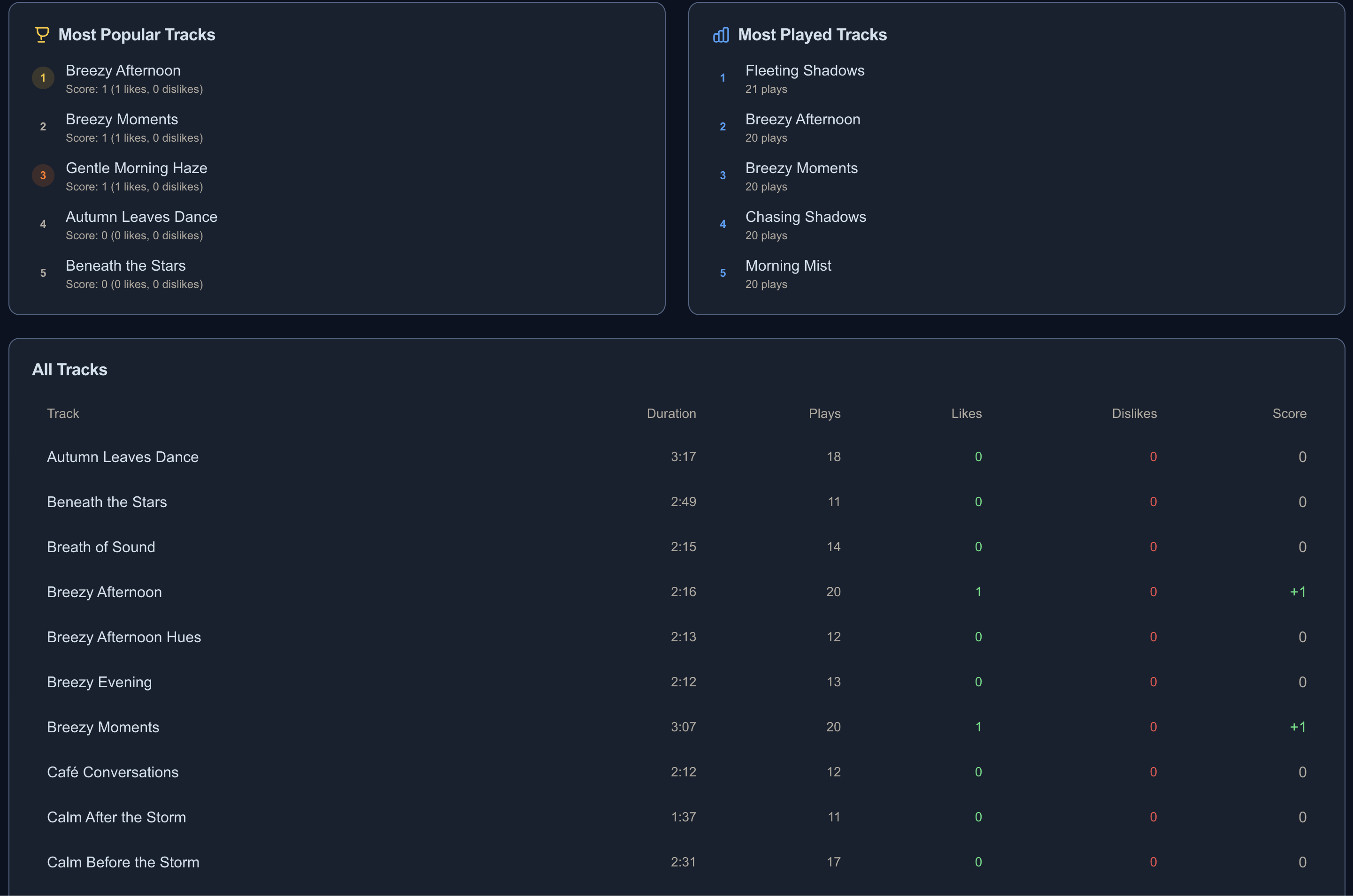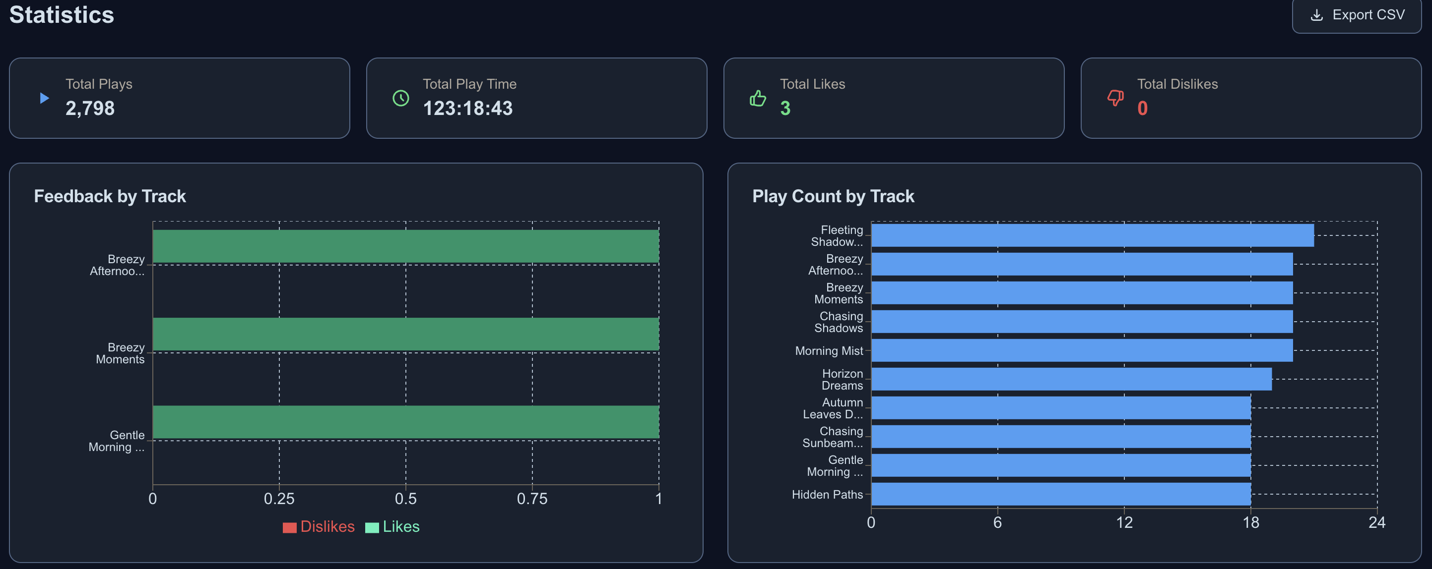 統計功能會記錄每首音訊的播放次數、喜歡數和不喜歡數,並提供 CSV 匯出功能。