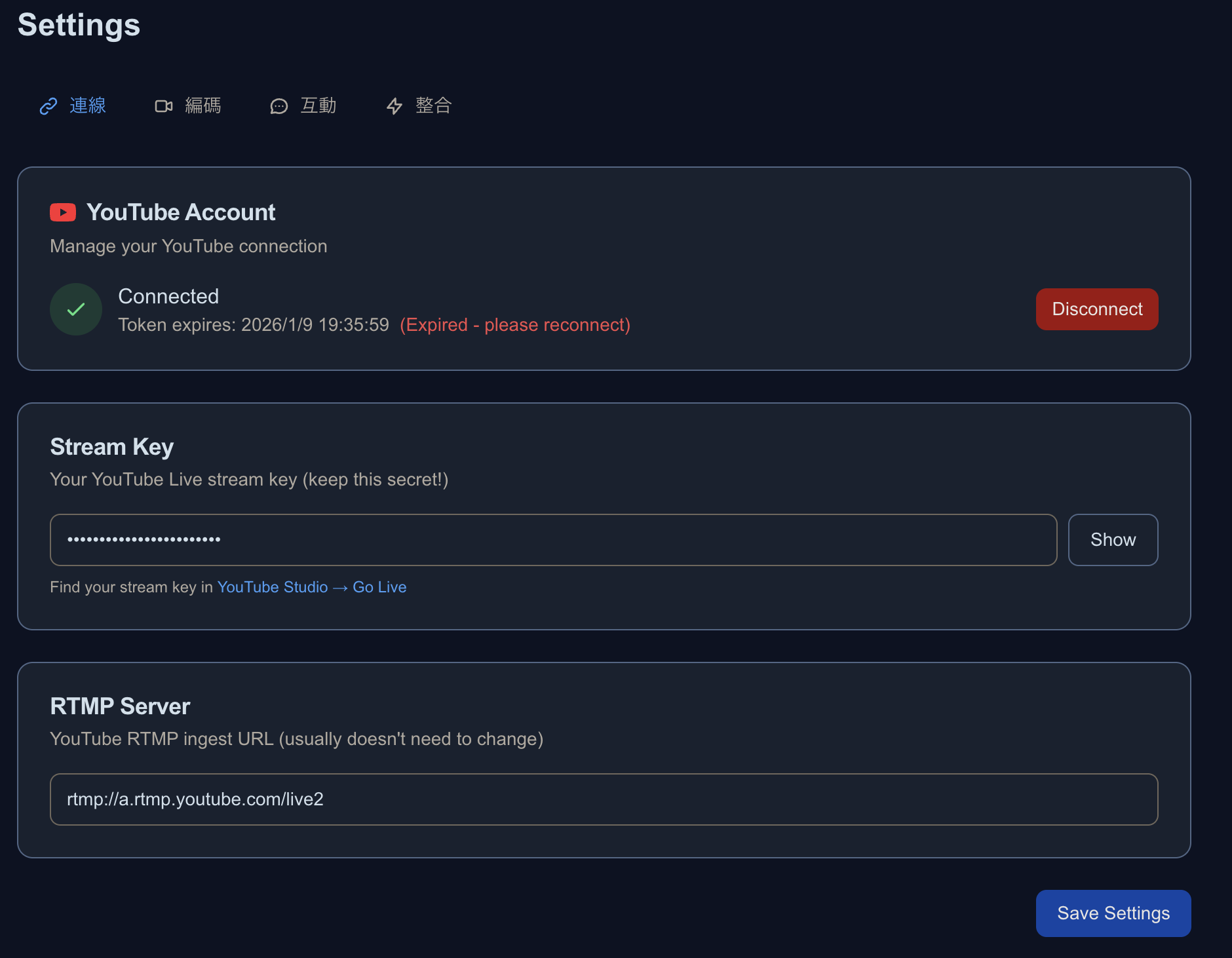 完整的 OAuth 整合讓用戶只需透過 Google 帳號登入,系統會自動管理 YouTube API 的 access token 和 refresh token,在 token 過期前五分鐘自動刷新,確保長時間運行不會因為認證問題中斷。