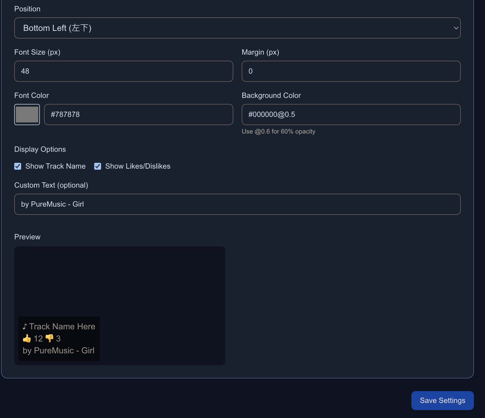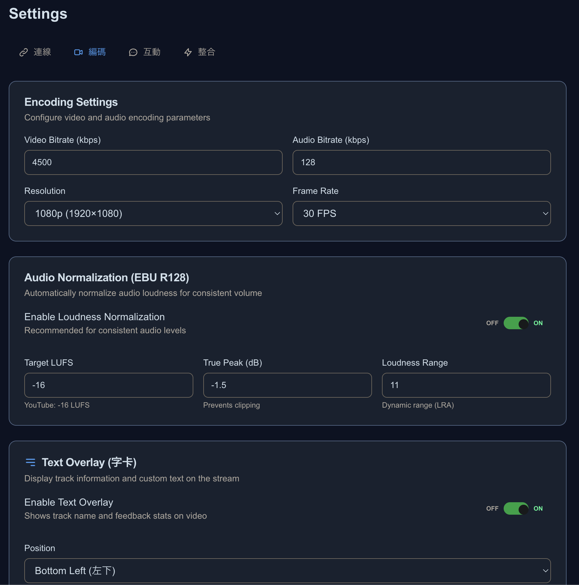 即時動態覆蓋功能利用 FFmpeg 的 drawtext 濾鏡,在直播畫面上即時顯示當前播放的音訊名稱和累計的喜歡踩數。當有觀眾發送回饋時,畫面會短暫顯示感謝訊息,五秒後自動消失,讓觀眾能立即看到自己的投票被接收。