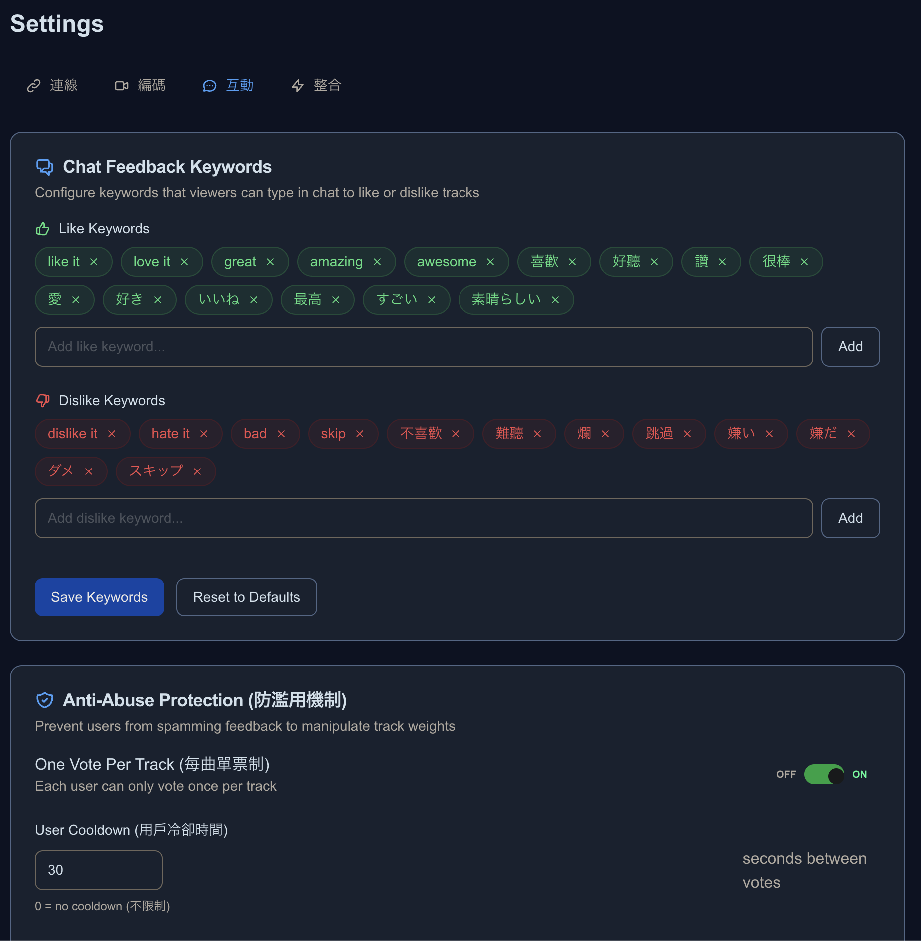 防濫用機制確保投票系統的公平性。每位觀眾對每首音訊只能投一票,並且設有用戶冷卻時間和每首音訊的投票上限。系統還會過濾掉機器人帳號自己發送的訊息,避免影響統計。