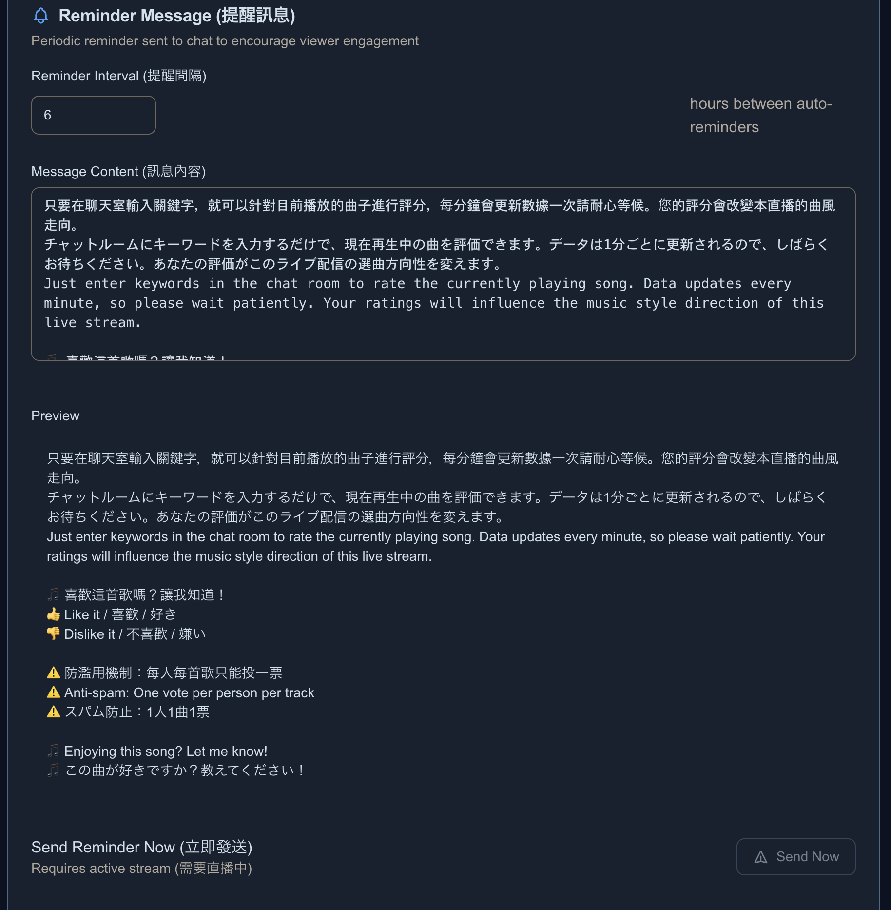 提醒訊息系統會在串流開始時以及每六小時自動向聊天室發送一則提醒訊息,告知觀眾如何使用關鍵詞進行投票,提高互動參與度。